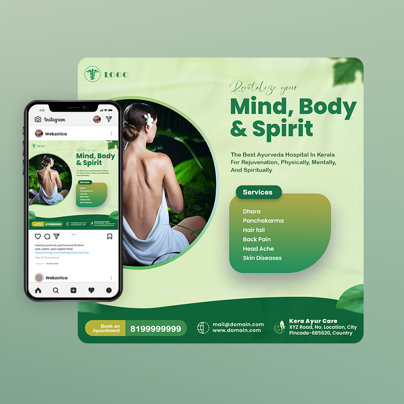 Are you looking to create the perfect healthcare service social media poster template?. This PSD ayurveda clinic poster template has everything you need to captivate and engage your audience. Let’s make your social media presence shine with ease!. Easily customize the designs for Instagram, Facebook, Twitter, or Pinterest. Just add your own images and showcase your work with style. With a variety of layout options, you’ll have everything you need to present your social posts in a visually striking and professional way.